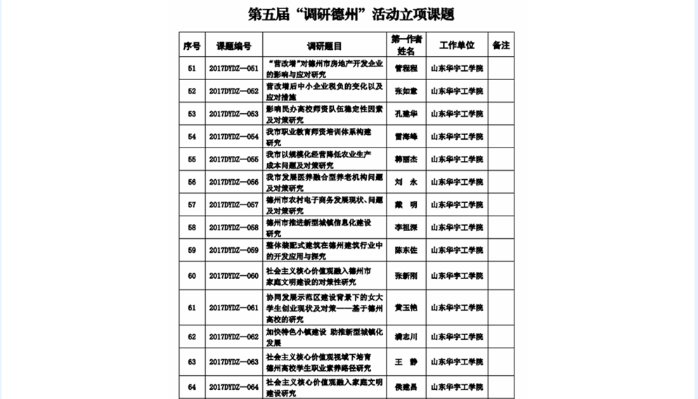 2017年5月,《山东华宇工学院校级课题项目》共申报课题三项,正在审批中。