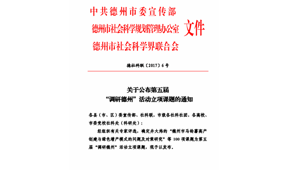 近日,中共德州市委宣传部、德州市社会科学规划管理办公室和德州市社会科学界联合会联合下发《关于公布第五届“调研德州”活动立项课题的通知》(德社科联[2017]6号)文件,我院辅导员满志川《加快特色小镇建设 助推新型城镇化发展》项目获批立项,实现我院学生工作队伍科研工作“零”突破,填补了课题申报领域的空白。