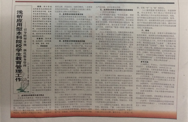 经过近一个月的努力,宣传处、质评中心联合组织专家组对各单位(部门)学习交流材料及各单位(部门)推荐的教职工学习心得进行审阅、评选。最终我院辅导员满志川老师《浅析应用型本科院校学生教育管理工作——引导转型升级 强化服务管理》得到专家组的一致认可,并刊登在山东华宇工学院报2016年12月1日第53期“本科思想大讨论”专题版面。