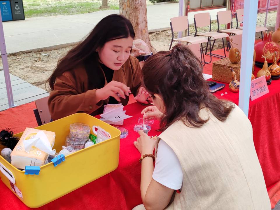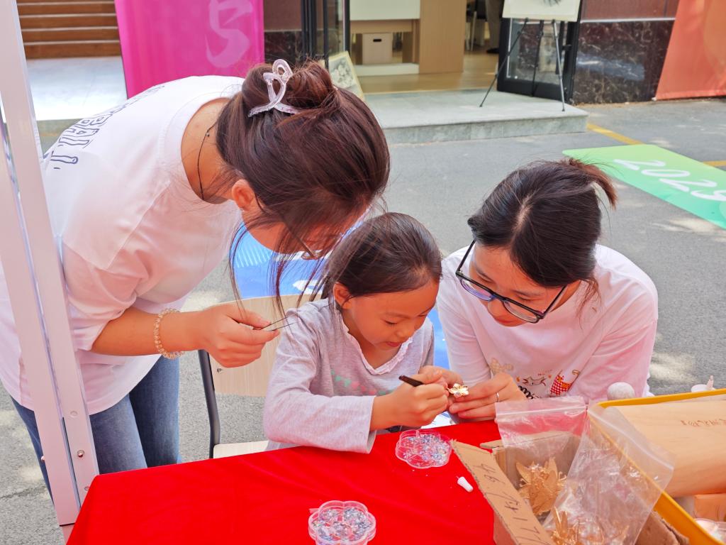 市集现场设置了建志剪纸、葫芦烙画、扎染、螺钿、合香五大非遗体验项目。每一位非遗传承人不仅现场展示精湛技艺,更耐心指导同学和家长们动手实践。剪纸声中寓意吉祥,烙画笔下勾勒匠心;扎染布里色彩斑斓,螺钿光影间闪烁传统之美,合香袅袅传递古今雅韵。许多新生家庭驻足体验,或俯身学习,或笑语交流,现场气氛热烈非常,成为迎新日中一道亮眼的文化风景。