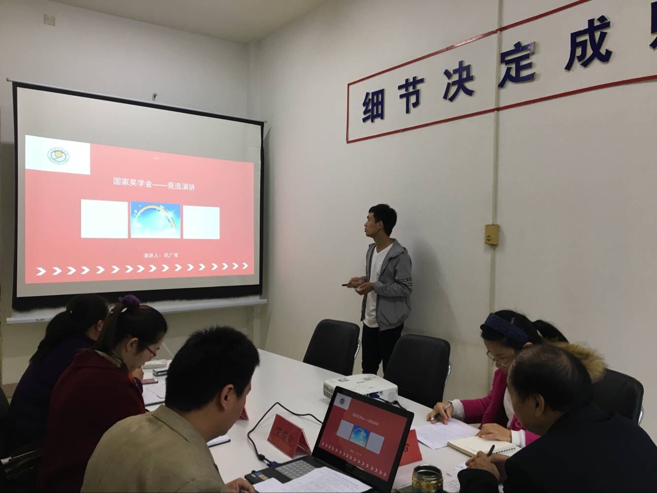 学院严格按照学校有关文件的规定,成立以学院院长为组长,分管学生工作的副院长和分管教学工作的副院长任副组长,学管科长、各教研室主任及相关班级辅导员组成评议小组。会上,首先学习了学校关于国家奖学金评审的相关文件。随后,三名申报学生依次进行汇报,分别从思想、学习、实践、生活等方面向在座的评委老师们展示了他们近一年来不懈的努力与成长。最后,在仔细了解申报学生的智育,综测和获奖情况的基础上,通过打分,各位评委老师一致决定将巩广军作为2017年国家奖学金获得者进行推荐,参加学校评审会。