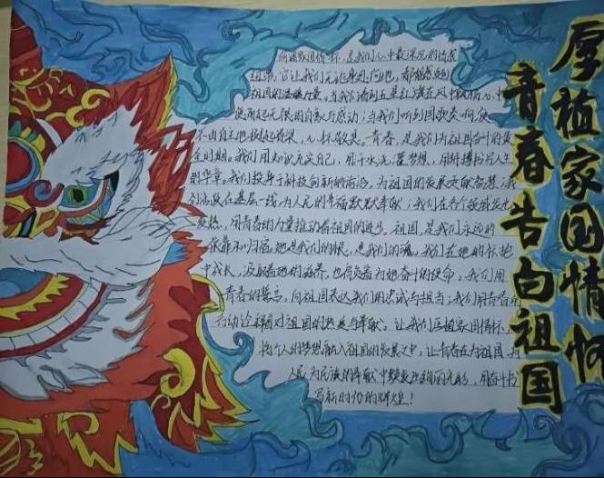 通过绘制黑板报与手抄报的形式展现同学们的文采与创意,激发青年学生对祖国与民族的深刻了解和热爱,增强学生的爱国情怀,在潜意识中接受爱国主义教育的熏陶,进一步激发同学们的责任感和使命感。