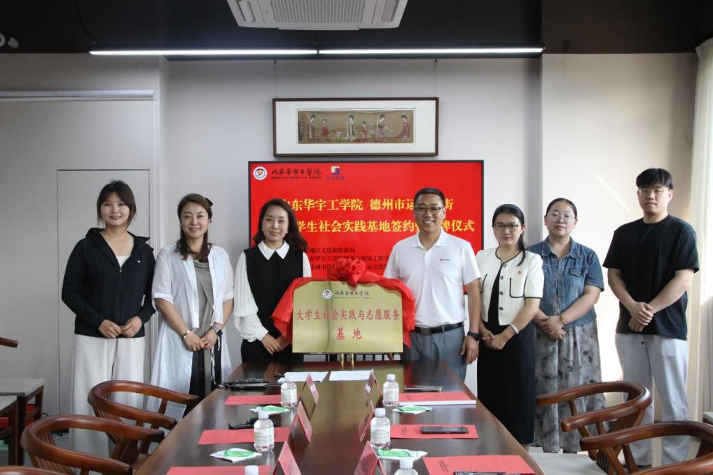 随后,德州祥运文化发展有限公司总经理周玮与学院团总支书记任秋燕签订合作协议,张璐局长与刘占凯书记共同为实践基地揭牌。仪式后,全体人员合影留念并参观运河古街,师生实地感受非遗项目与传统技艺的历史韵味。