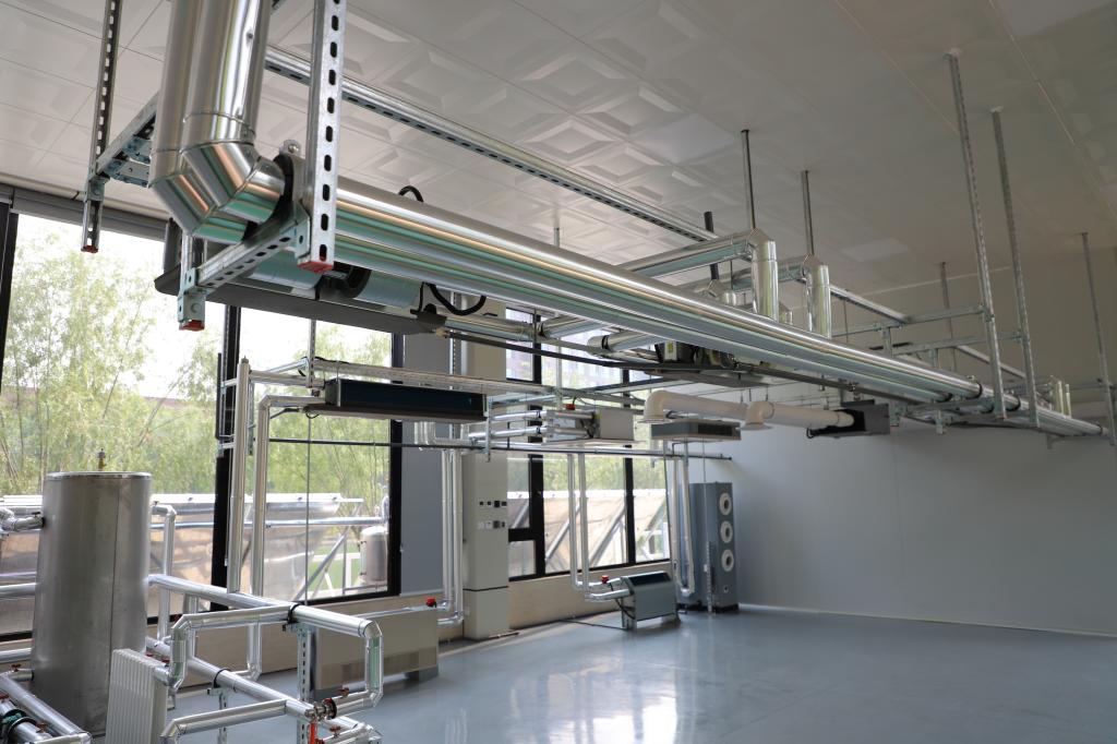 多能源互补利用系统运行及性能测试工作坊主要配备空气能热泵系统、水源热泵系统、定压补水系统、末端产品系统以及电控系统等组成的真实空调系统。支撑二层高效热泵空调设备及系统节能技术研究室的研究工作。该工作坊可以帮助学生了解多能源互补利用空调系统的结构组成、设备部件及其连接方式,支持学生进行相关系统的设计,培养学生的工程设计能力。