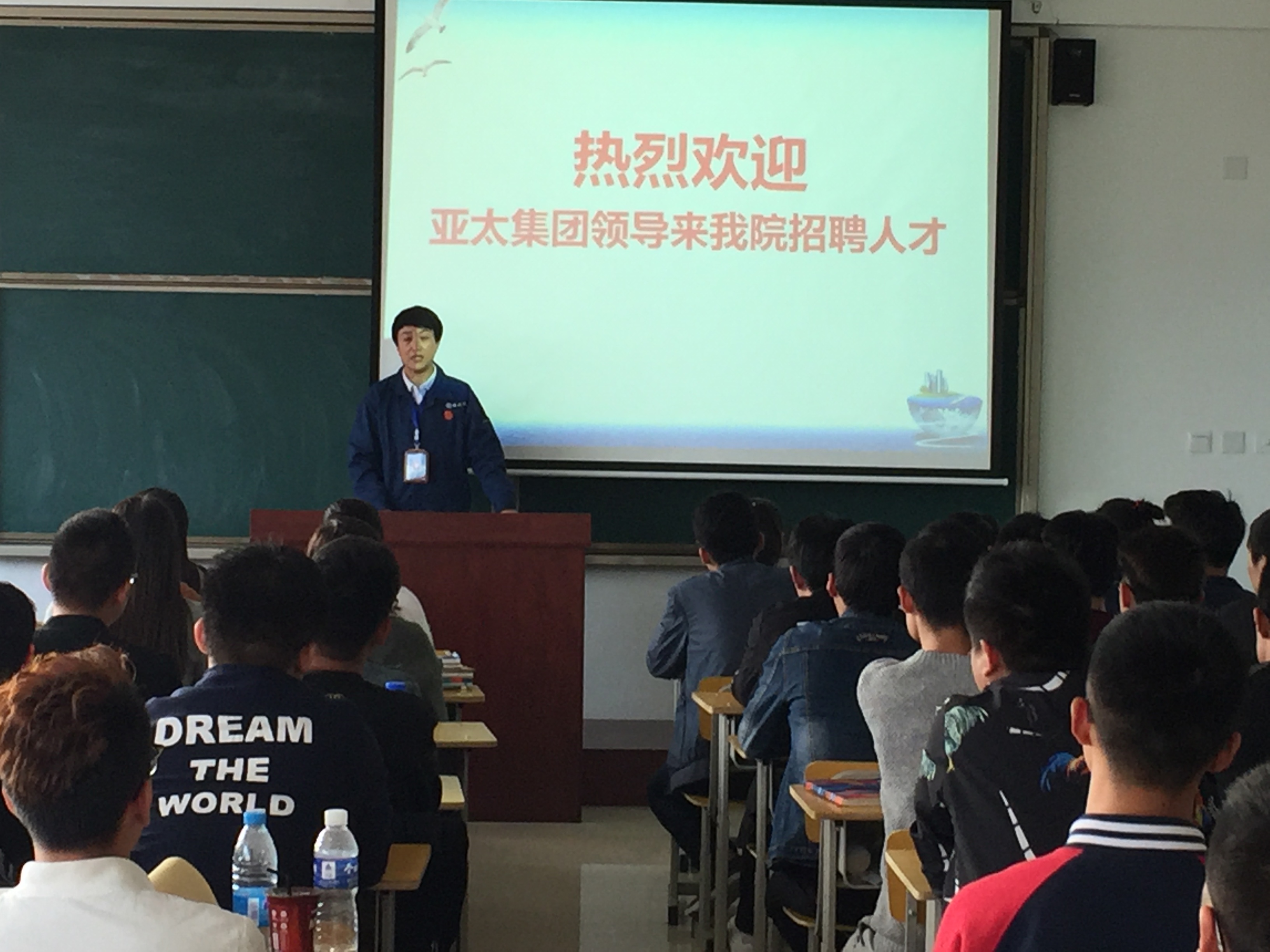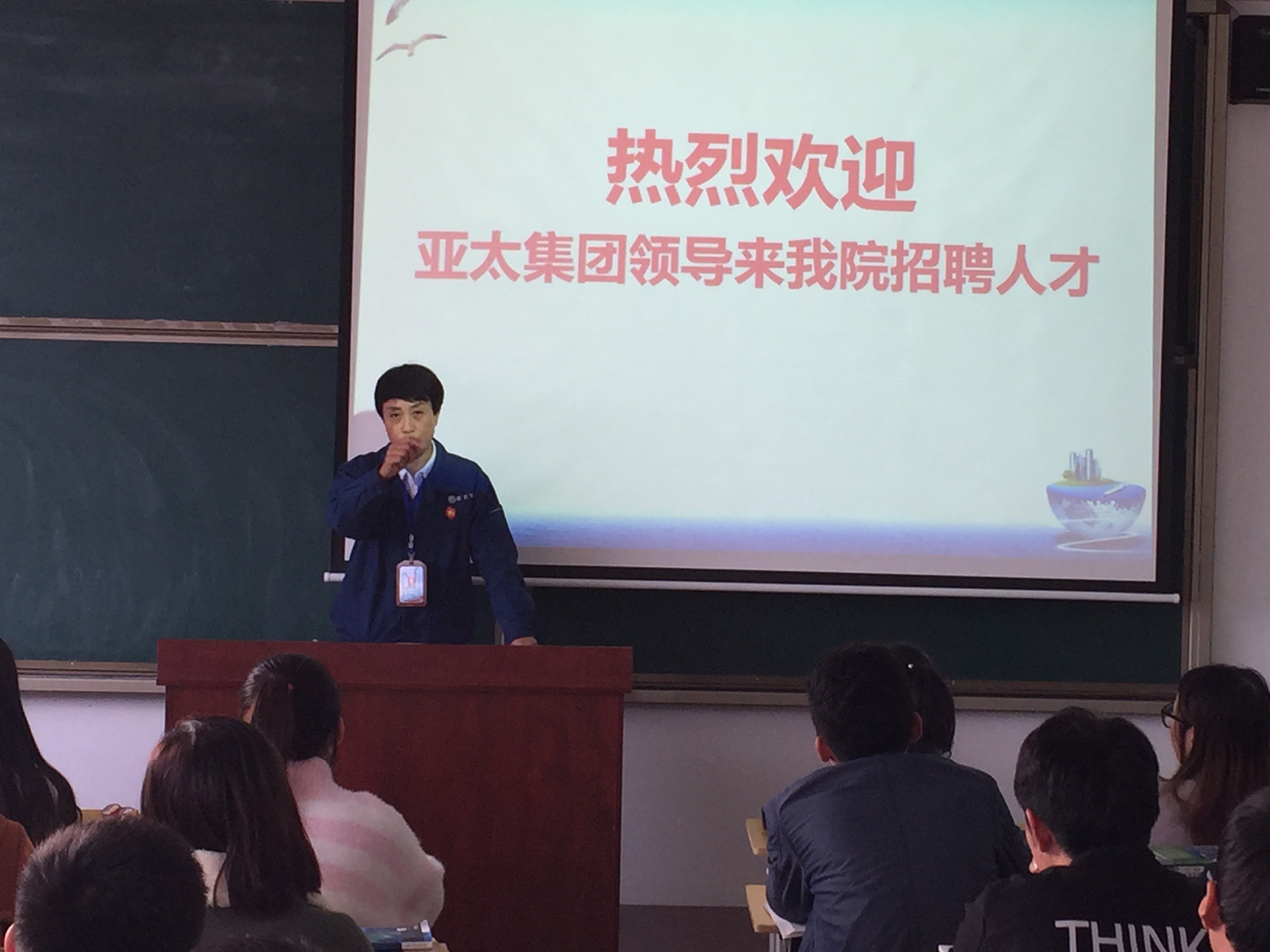 2017年11月9日,德州亚太集团人力资源部部长,携人力资源部相关负责人到我院15级制冷与空调技术专业进行宣讲、招聘。部长给同学们详细讲解了亚太集团的企业文化、发展历史、主营产品、全国各地办事处分布及附属行业,同时说明了集团今年的人才需求计划及相关福利待遇,集团为同学们提供了广阔的发展平台,希望同学们踊跃报名,加入亚太集团,成为集团大家庭的成员。