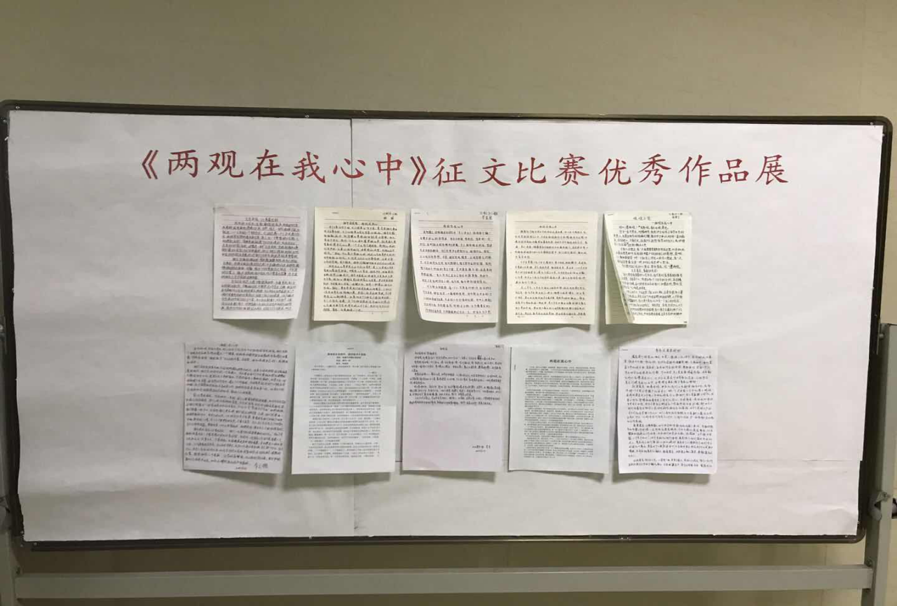 为进一步深入开展“两观教育”活动,使2018届毕业生真正理解“两观”理念,按照“两观”的思想指导自己顺利就业,我院在2018届毕业班中开展以“两观在我心中”为主题的征文活动。