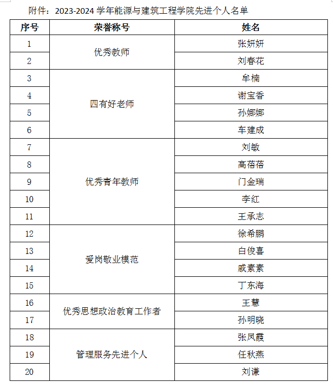 为激励风清气正、团结协作、积极向上的优秀团队,表彰履职尽责、勤勉敬业、积极进取的先进个人,按照《山东华宇工学院关于开展2023—2024学年先进集体和先进个人评选活动的通知》鲁华宇院政人字〔2024〕12号文件要求,经个人申报、各办公室推荐和学院评选工作小组评议后,现将先进个人名单公示如下。