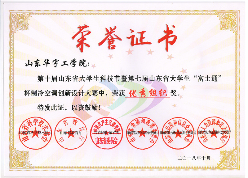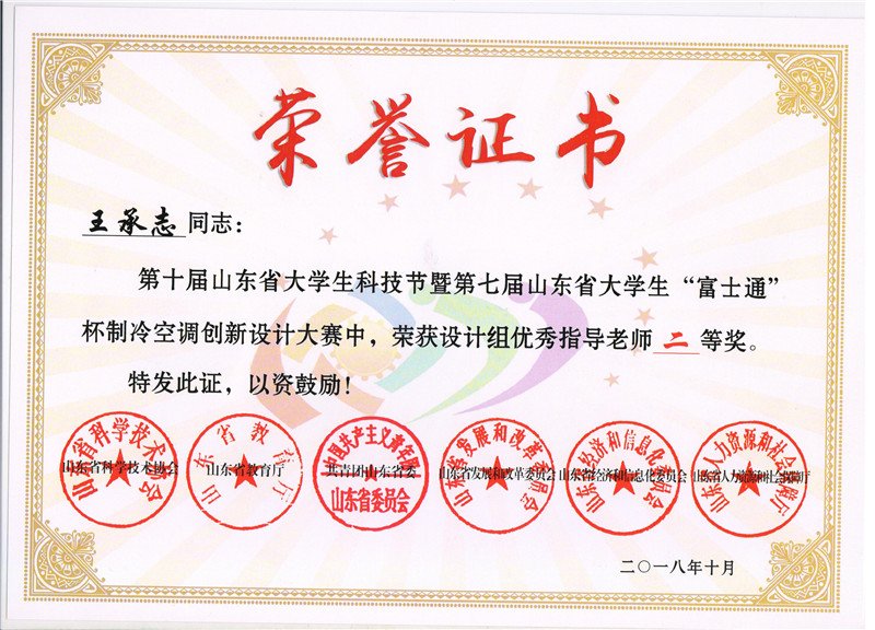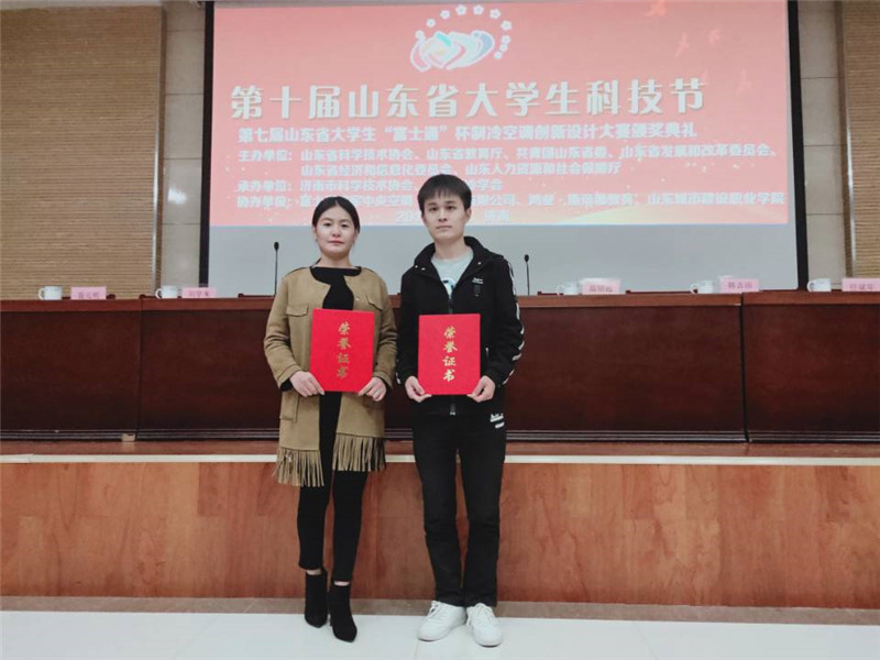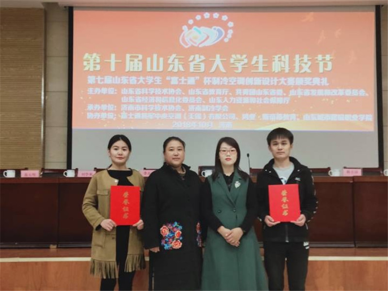 第十届山东省大学生科技节暨第七届山东省大学生“富士通将军”杯制冷空调创新设计大赛颁奖典礼于山东城市建设职业学院图书馆报告厅隆重举行。能源与环境工程学院学生的参赛作品在大赛中获得二等奖1项,三等奖2项,优秀奖若干项的优异成绩。魏丰君、王燕、相培等老师获得优秀指导教师奖。同时,我院因参与大赛积极性高,作品质量整体较好,被大赛组委会授予优秀组织奖。我院的2018届毕业生王宗伟、单宝琦两位同学考入了山东建筑大学研究生,这次代表建筑大学参赛并获奖,与我院2015级建环专业参赛学生王梦瑶、宋玉坤同台领奖,成为颁奖典礼现场的一个亮点。
