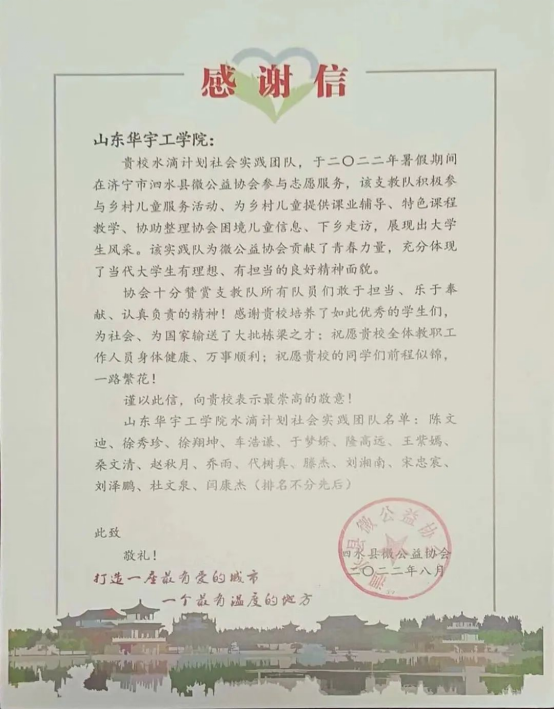 2022年7-8月暑假期间,由山东华宇工学院西部爱心公益社发起的暑期支教活动正进行得如火如荼,此次支教共计招募志愿者120余人,在经过层层选拔和培训后,共有33位同学组成3组支教队伍,分别进行社会实践。