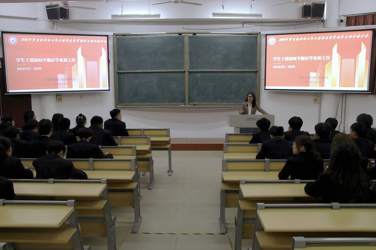 为提升学生会及学生组织工作效率与成员综合素质,6776永利集团团总支于3月23日晚在10号楼F401教室召开2025年学生会全体工作大会暨春季学期学生组织培训会。会上,学院团总支书记任秋燕老师作了题为《学生干部如何平衡好学业和工作》的专题讲座。