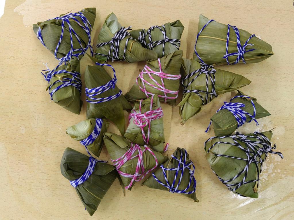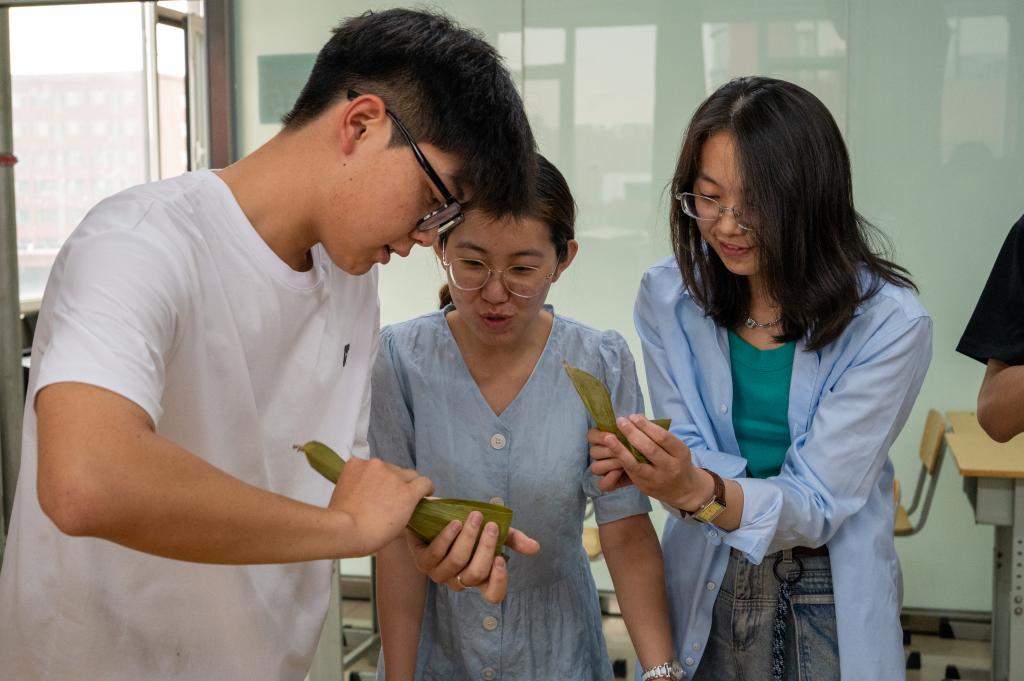 活动期间,现场欢声笑语连绵不断。师生们围在一起:折粽叶、装糯米、放馅料、裹扎绳,讨论着包粽子的技巧方法,兴致盎然地动手实践。有的同学虽初次尝试,但在经验丰富的老师或同学的悉心指导下,逐渐掌握窍门。活动现场,同学们精心准备的粽叶散发着独特清香,各类丰富的食材如江米、蜜枣、红豆、葡萄干等一应俱全,大家根据自身喜好制作不同口味的粽子。