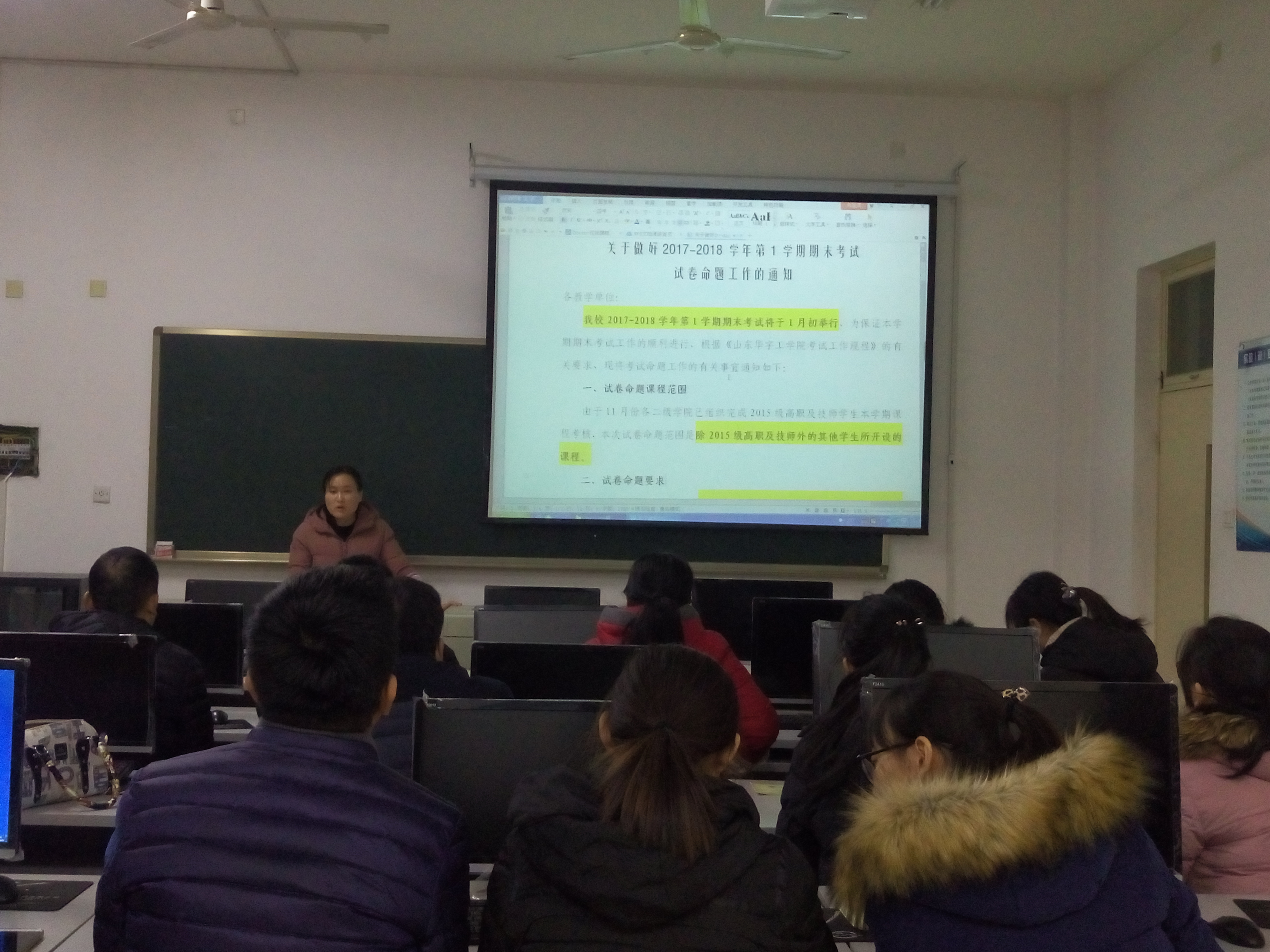 本次期末考试命题专项会议是我院推进迎评促建工作深入开展的一次重要会议,对规范我院试卷命题工作有着重要意义,我院将结合本科学士学位合格评估要求,严格按照学院试卷命题规则及要求完成2017-2018学年第1学期期末考试试卷命题工作。(撰稿人:王燕)