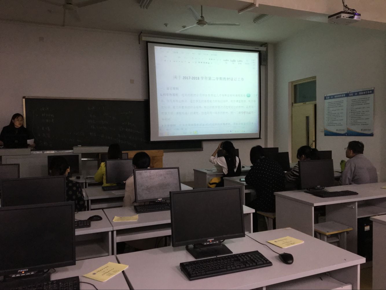 2017年10月25日下午,我院根据学校教务处要求在16号楼304组织召开了2017-2018学年第二学期教材征订工作会议。副院长魏丰君,各教研室主任、教学秘书、教师参加了会议。教学科长王燕主持。