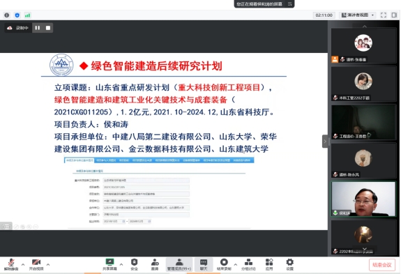 侯和涛教授作为山东省绿色建筑智能建造工程和工业化建筑智能制造的领军人物,长期从事装配式钢结构建筑、预制混凝土结构、钢-混凝土组合结构的研究和应用工作。讲座中,侯教授从装配式建筑发展背景、政策支持、发展困惑、适用技术体系、智能建造、发展研究等6个方面,回顾了建筑工业化发展以及评价标准的演变历程,详细介绍了“十四五”时期新型建筑工业化的发展趋势,发展装配式建筑存在的问题与对策。同时,对我院在装配式建筑推广应用等方面的研究工作提出了针对性建议。